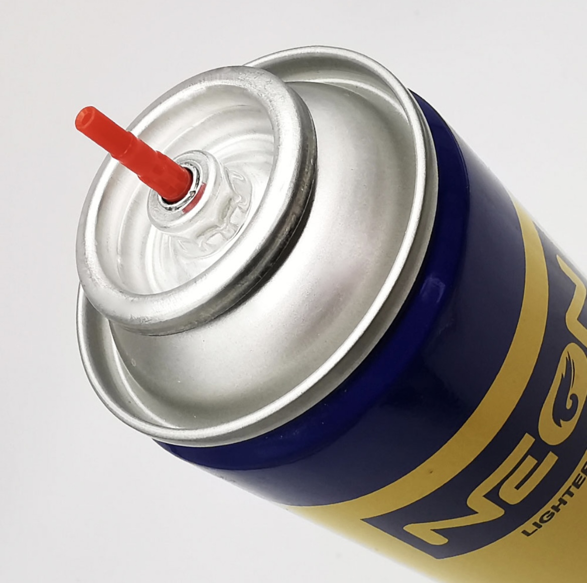 - برای پر کردن فندک، قوطی را رو به پایین نگه داشته و نازل را بر روی والو قرار دهید. نصفه ته قوطی را با دست نگه داشته و به صورت عمودی به سمت پایین بر روی سوراخ گاز گیری فندک فشار دهید.